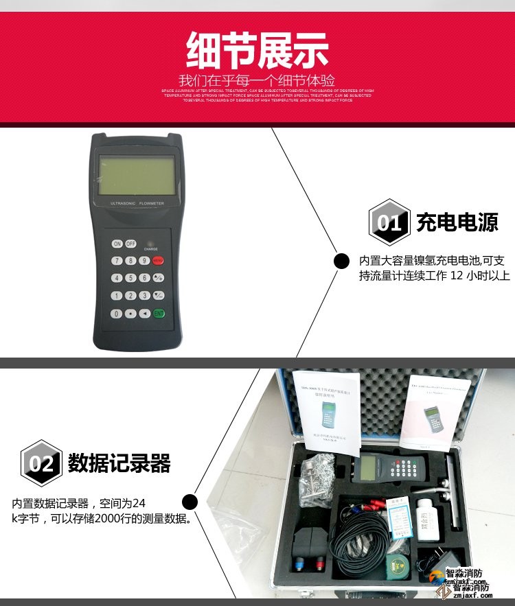 超聲波流量計(jì)測(cè)量管徑范圍:0mm~300mm;WWW.XFJCYQ.COM精度:±1%用于檢測(cè)消火栓系統(tǒng)和水噴淋系統(tǒng)的給水量以及消防豎管的流量分配。