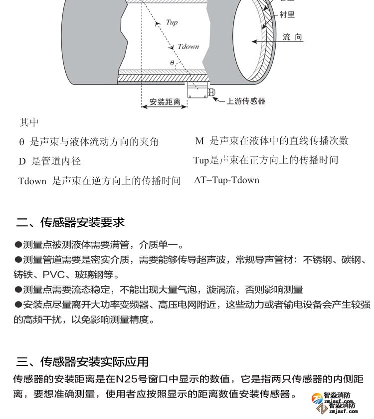 超聲波在流動(dòng)的流體中傳播時(shí)就載上流體流速的信息。因此通過(guò)接收到的超聲波就可以檢測(cè)出流體的流速,從而換算成流量,圖1。